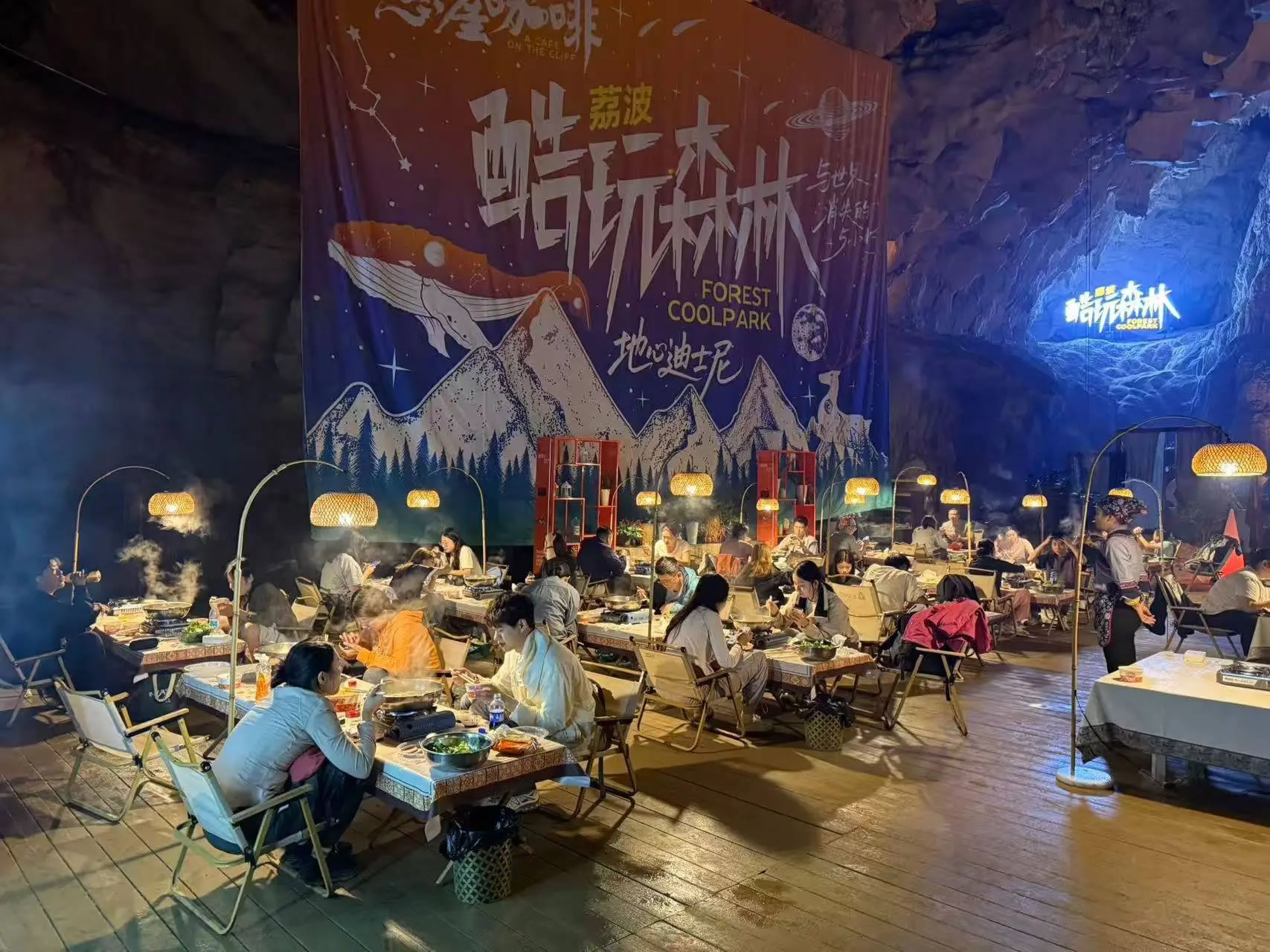 探險(xiǎn)之后,在常年保持15攝氏度的洞穴餐廳,吃上一頓熱氣騰騰的火鍋,感受與洞外溫差帶來(lái)的獨(dú)特體感,成為游客們的特別享受。開(kāi)闊的洞廳內(nèi),數(shù)十張餐桌整齊排列,餐桌上方的暖色照明燈既保證了用餐所需的足夠亮度,又完整保留了洞穴的自然氛圍。游客們一邊圍坐火鍋旁大快朵頤,一邊欣賞巖壁上自然形成的奇異紋路,感受這個(gè)地下空間獨(dú)有的神秘。