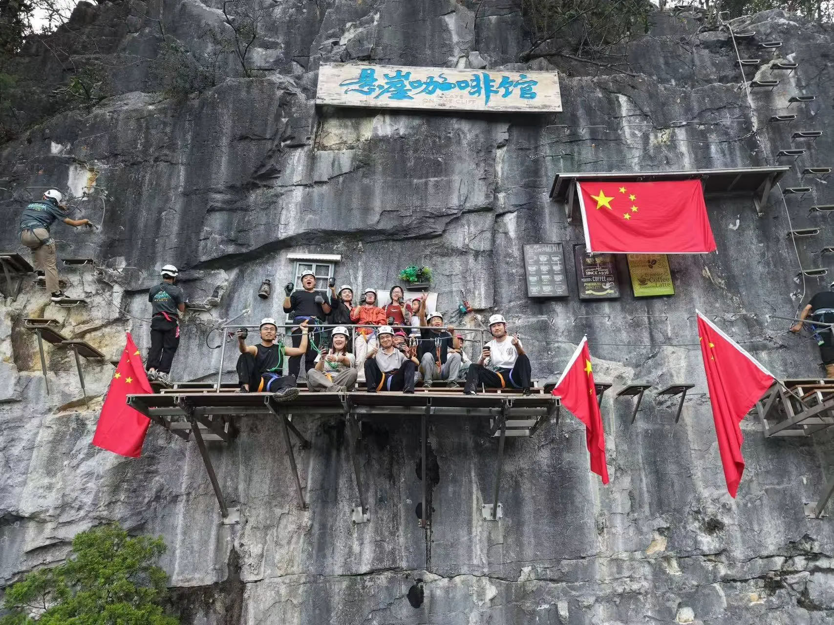在距離地面200米的崖壁上喝上一杯咖啡,也是酷玩森林最受歡迎的項(xiàng)目之一。游客佩戴專業(yè)登山裝備,在教練陪同下沿固定路線攀登至懸崖中段的休息平臺(tái)。站在平臺(tái)上,山川云海盡收眼底,隨手拍都是 “朋友圈大片”,刺激又出片。