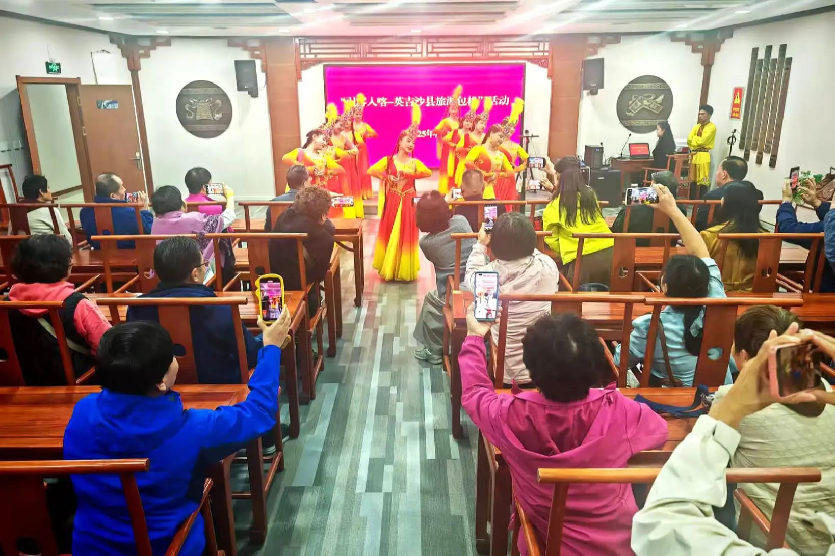 沿著英吉沙旅游精品路線,游客先后到南湖旅游度假區(qū)鳥類科普館、小刀博物館,芒辛鎮(zhèn)小刀村、土陶村和魯疆達(dá)瓦孜非遺演藝中心等地,近距離觸摸世界上最大的英吉沙手工小刀,參觀新疆目前最大的鳥類活體標(biāo)本主題展館,觀賞驚險刺激的達(dá)瓦孜表演。