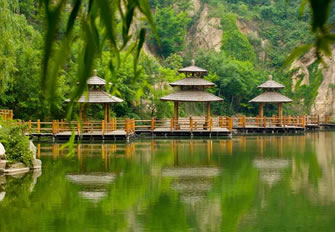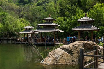 九如山以自然山水而聞名,山依水勢(shì),水奪天工,托起一片世外奧區(qū)。遠(yuǎn)遠(yuǎn)望去,可見泉涌成溪,溪流成瀑,瀑落成潭,潭潭相通,匯集成八潭明鏡。是所謂:峽谷有流,聚在平湖,山泉涓滴,匯成高潭。層層疊嶂,層層儲(chǔ)水,一年四季,不管天公旱澇,無論氣候寒暑,九如山的潭水總是那樣清瑩玉潔,滋潤山體。游人可以在潭中泛舟,可以在池邊戲水,享受天開畫境,觸摸水景幻變,放懷吸取大自然的無窮靈感。