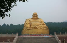 彌勒勝苑正門的牌坊高9.9米,寬12.5米,為四柱三門沖天式,整體造型莊重博大,氣勢不凡。主佛像為大肚彌勒佛,佛像通體高20米,采用3mm銅板焊接而成,花崗石質的蓮花寶座高約9米,直徑30米,號稱“江北第一大佛 ”。佛像周圍的巖壁,雕刻了十八羅漢。主佛像身后的環(huán)形山崖上,是彌勒佛的生平事跡介紹的大型浮雕,其長36米,高3.5米,面積126平方米。