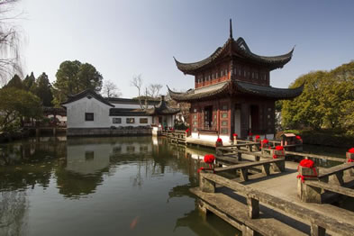 紫菱洲為賈赦之女賈迎春的居所,因她在海棠詩社中號(hào)“菱洲”。這是兩座相同式樣的建筑,中間以七曲橋連接,兩端各有三曲橋。漲水時(shí),曲橋平臥。