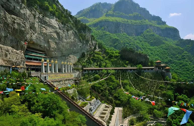 天橋是因修筑在懸崖絕壁上的棧道而得名,有千余年的歷史。長300余米,寬 1 米多,上離峰頂80余米,高入云表;下距溝底300余米,懸于危巖上。每逢雨過云涌,人在橋上過,云在腳下飛,使人有平步青云,飄飄欲仙之感。景區(qū)內主要建筑是洞神宮、祖師殿、七真殿、水母殿、懸空長廊等和回頭看柏龍、兔橋、須彌石等名勝景觀。有孔明和張良等人的修行洞。此外還有中國古代最險絕的軍事堡壘——石勒寨,地勢險峻,易守難攻。