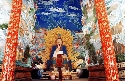 6、大羅宮是一座依山而建的明四暗七仿古建筑,總面積達30000平方米,堪與布達拉宮媲美,為天下第一道宮。宮內300平方米中國百位名家題寫的《道德經(jīng)》木刻,以及300平方米的布畫都是中國一絕。