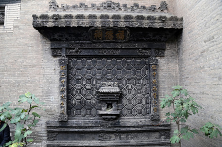 喬家大院大門(mén)坐西向東,為拱形門(mén)洞,上有高大的頂樓,頂樓正中懸掛著山西巡撫受慈禧太后面喻而贈(zèng)送的匾額,上書(shū)“福種瑯環(huán)”四個(gè)大字。黑漆大門(mén)扇上裝有一對(duì)椒圖獸街大銅環(huán),并鑲嵌著銅底板對(duì)聯(lián)一付:“子孫賢,族將大;兄弟睦,家之肥。”字里行間透露著喬在中堂主人的希望和追求,也許正是遵循這樣的治家之道,喬在中堂經(jīng)過(guò)連續(xù)幾代人的努力,達(dá)到了后來(lái)人丁興旺、家資萬(wàn)貫的輝煌。大門(mén)頂端正中嵌青石一塊,上書(shū)“古風(fēng)”。大門(mén)對(duì)面的掩壁上,刻有磚雕“百壽圖”,一字一個(gè)樣,字字有風(fēng)采。百壽圖為“在中堂”主人喬致庸的孫婿、近代著名學(xué)者、篆書(shū)家常贊春書(shū)寫(xiě)。掩壁兩旁是清朝大臣左宗棠題贈(zèng)的一付意味深長(zhǎng)的篆體楹聯(lián):“損人欲以復(fù)天理,蓄道德而能文章!遍侯~是“履和”。甬道的西盡頭處是雕龍畫(huà)棟的喬氏祠堂,與大門(mén)遙相對(duì)應(yīng)。祠堂裝點(diǎn)得十分講究,三級(jí)臺(tái)階,廟宇結(jié)構(gòu),以獅子頭柱,漢白玉石雕,壽字扶欄,通天欞門(mén)木雕夾扇。出檐以四條柱子承頂,柱頭有玉樹(shù)交榮、蘭馨桂馥、藤羅繞松的鏤空木雕。額頭有匾,上書(shū)“仁周義溥”四字,李鴻章所題。祠堂里原陳列著木刻精雕的三層祖先牌位。