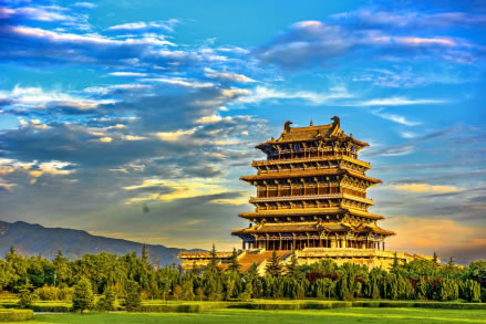 鸛雀樓為高臺(tái)式十字歇山頂樓閣,外觀3層4檐,內(nèi)部為9層使用空間,并設(shè)置電梯、樓梯組織垂直交通。整座樓閣分為臺(tái)基和樓身兩部分,總高度達(dá)73.9米,是四大名樓中最高的一座,是中國仿造樓中較為精致的。鸛雀樓整個(gè)的油漆彩畫,是國內(nèi)失傳的唐代彩畫藝術(shù),經(jīng)過國家文物局的專家多方考察搶救,重新創(chuàng)作設(shè)計(jì),故鸛雀樓是國內(nèi)唯一采用唐代彩畫藝術(shù)恢復(fù)的唐代建筑。