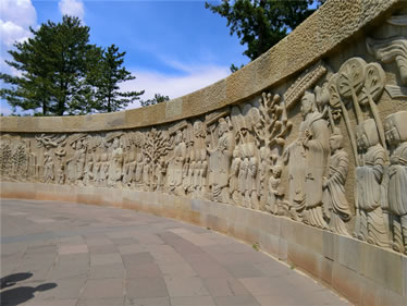 穿過神柱林立的佛光大道向西,呈現(xiàn)于世人眼前的是兩面相對的扇形皇家禮佛浮雕墻。這組正面相對的浮雕墻總體呈圓弧狀,長約20米、高約4米,畫面構(gòu)圖完美,雕刻細致,以高浮雕的形式,生動表現(xiàn)了北魏皇家盛大的帝后禮佛圖。車轔轔、馬蕭蕭的現(xiàn)場氣氛,充分再現(xiàn)了北魏當(dāng)時皇帝、皇后前往禮佛的莊嚴肅穆的宏大場面,這種場面讓人自然聯(lián)想到1500多年前云岡石窟作為皇家寺院曾經(jīng)的輝煌,讓人舉目流連。