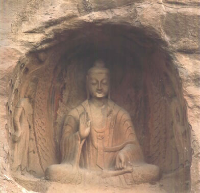 早期石窟:即今第16~20窟,亦稱為曇曜五窟。根據(jù)《魏書·釋老志》(卷114)記載:“和平初,師賢卒。曇耀代之,更名沙門統(tǒng)。初,曇耀于復(fù)法之明年,自中山被命赴京,值帝出,見于路,御馬前銜耀衣,時人以為馬識善人,帝后奉以師禮。曇曜白帝,於京城西武州塞,鑿山石壁,開窟五所,鐫建佛像各一,高者七十尺,次六十尺,雕飾奇?zhèn),冠于一世!蔽闹杏浭龅拈_窟五所,就是當(dāng)時著名的高僧曇曜就選擇了鐘靈毓秀的武州山,開鑿了雄偉壯觀的曇曜五窟,揭開了云岡石窟開鑿的序幕。第16~20窟即帝王象征的曇曜五窟,以造像的風(fēng)格和創(chuàng)作的技法來看,是云岡全窟群中最早的五個窟。平面為馬蹄形,穹隆頂,外壁滿雕千佛。主要造像為三世佛(過去、現(xiàn)在、未來),佛像高大,面相豐圓,高鼻深目,雙肩齊挺,顯示出一種勁健、渾厚、質(zhì)樸的造像作風(fēng)。其雕刻技藝繼承并發(fā)展了漢代的優(yōu)秀傳統(tǒng),吸收并融合了古印度犍陀羅、秣菟羅藝術(shù)的精華,創(chuàng)造出具有獨特的藝術(shù)風(fēng)格,這是中外融合所形成的新的藝術(shù)風(fēng)格。