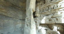 第7窟前室北壁上開明窗,下鑿窟門,壁面風(fēng)化嚴重,但其窗門外側(cè)殘留的多層造像與印度阿旃陀的大拱門洞窟外壁雕刻十分相似。第7窟前室東壁上部均分層分欄雕刻佛本生故事畫面。后室北壁造像分為上下兩層大龕,下層龕內(nèi)為二佛并坐。上層龕內(nèi)中央主像為交腳彌勒菩薩,兩側(cè)為倚坐佛像。