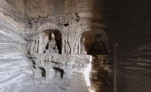 拱門高3.1米,寬2.25米。外側(cè)雕刻尖形門楣,內(nèi)飾忍冬紋。門外西側(cè)崩塌,經(jīng)近期修補,東側(cè)現(xiàn)存一力士,風(fēng)化嚴重。拱門西壁下部風(fēng)化嚴重。中部北側(cè)雕一圓拱龕,內(nèi)為坐佛。龕外兩側(cè)各雕一脅侍菩薩。龕楣內(nèi)雕七佛,龕兩側(cè)各雕五重千佛龕。中部南側(cè)雕一方形龕,內(nèi)為坐佛,龕外兩側(cè)各雕一脅侍菩薩。上層為方形帷幕龕,西壁雕坐佛坐于蓮座之上,兩側(cè)各雕一脅侍菩薩,南、北兩壁各雕一立佛,下雕蓮座。拱門東壁中、下部雕零散小龕,風(fēng)化嚴重。上部北側(cè)雕三層佛塔一座,塔下雕一圓拱龕,內(nèi)為坐佛。南側(cè)雕一盝形帷幕龕,內(nèi)為交腳菩薩,龕南側(cè)崩塌,F(xiàn)存北側(cè)一思惟菩薩與飛天。龕楣方格內(nèi)雕坐佛。 |