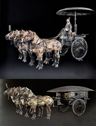 銅車馬是秦始皇的陪葬品之一,象征著秦始皇鑾駕的一部分。銅車馬的形制是模仿實實在在真車的形狀。以前考古發(fā)現(xiàn)的車都是木質(zhì)的,出土?xí)r已腐朽,銅車馬的出土使今人能夠清楚地看到古代御用車駕的真實面貌。銅車馬是按秦始皇御用車隊中屬車二分之一的比例縮小制成的,車蓋以及車輿內(nèi)外彩繪著精美的紋樣;兩乘銅車馬上的金銀飾品重達(dá)14公斤,顯示了銅車馬高貴的等級。