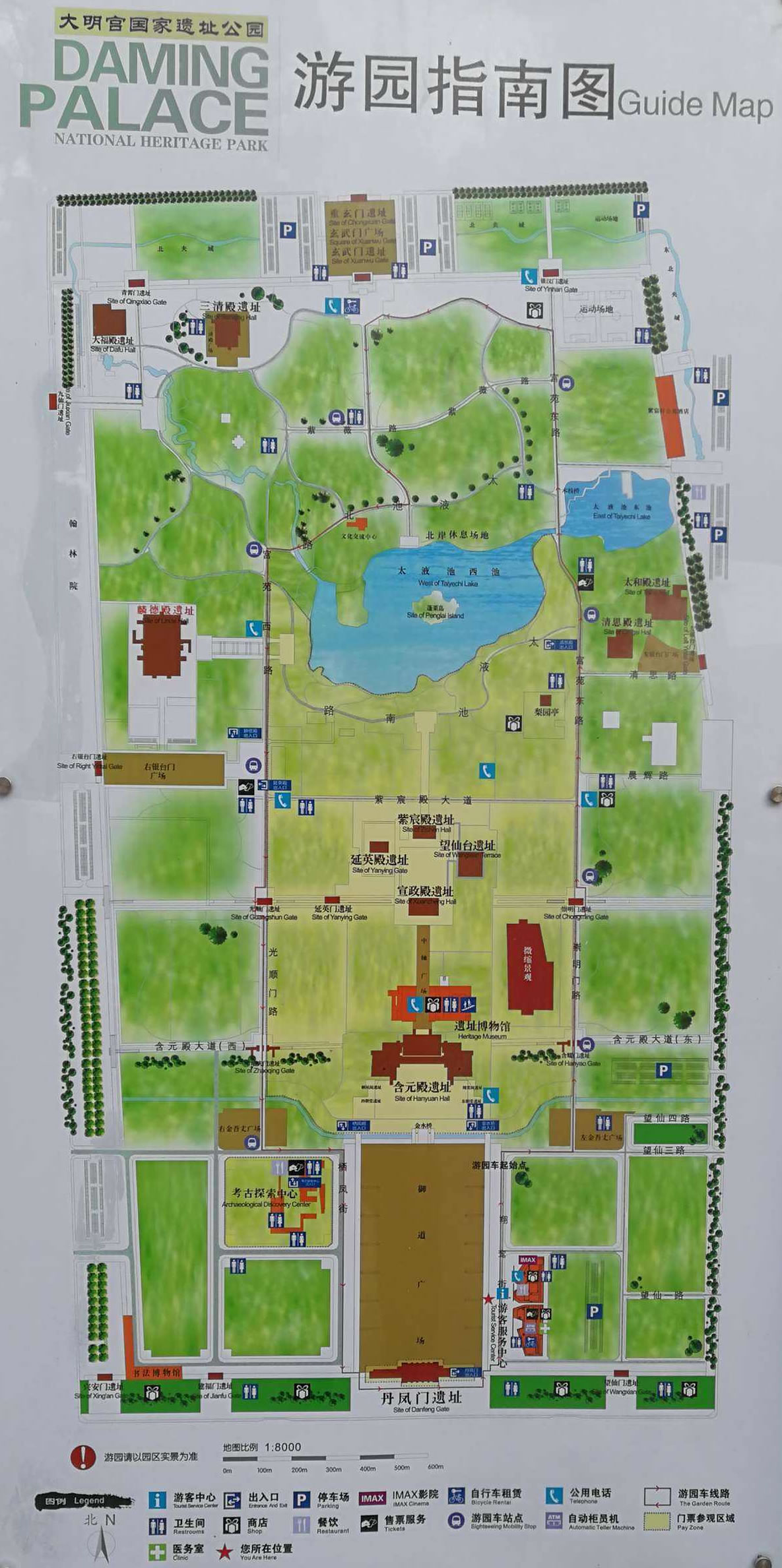 大明宮國家遺址公園延續(xù)唐代大明宮的歷史格局,由南向北沿丹鳳門—含元殿—宣政殿—紫宸殿—玄武門—重玄門,為中軸線,分為殿前區(qū)、宮殿區(qū)、宮苑區(qū)三大區(qū)域。