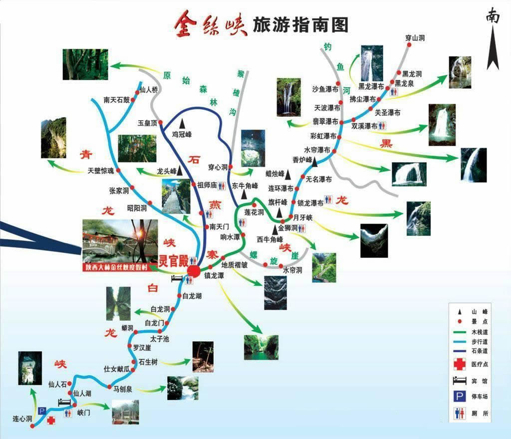 該景區(qū)還有以下觀賞景點:翰墨崖,古藤、蝙蝠崖、懸棺、白龍門等。這里集奇花奇石奇湖于一體,有窄、長、秀、奇、幽的顯著特點,中山地貌,峽谷開闊,眾多蘭草散生其間,號稱“秦嶺第一蘭花谷”。
