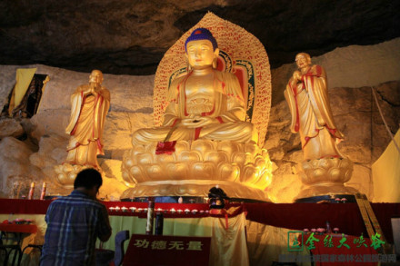 金獅洞外谷底深潭邊的石壁上,有一彌勒佛像,藏于濃密的草木間。