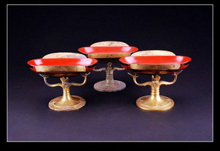 1981年5月茂陵一號(hào)無名冢南出土,整體分為座、杯上下兩部分,座為盤足,柿蒂狀支架,承托耳杯。酒杯平面呈橢圓形,圓形底,兩側(cè)附耳,紋飾華美,漆工與鎏金皆精湛,是研究西漢工藝美術(shù)史的珍貴實(shí)物資料。