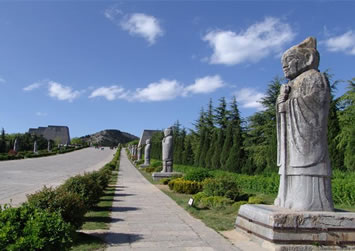從梁山南二峰的天然雙闕起,往北依次對稱排列。端立首位的是1對高達8米有余的八棱柱石華表,這是帝王陵墓的標(biāo)志,其造型昭示著生命長存的理念和古代先民對人類生殖行為的崇拜。接著是一對昂首挺胸、渾圓壯觀的石刻翼馬,馬身兩翼雕以卷云紋,似有騰飛之勢。翼馬之北是1對優(yōu)美的高浮雕鴕鳥,是唐王朝同西域人民文化交流與友好往來的象征。緊接鴕鳥的是5對配有馭手的石仗馬和10對高4米左右的石翁仲(或稱直閣將軍)。