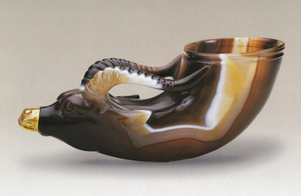 酒器,長15.5厘米,口徑5.9厘米。鑲金獸首瑪瑙杯選材精良,巧妙利用玉料的俏色紋理雕琢而成。杯體為角狀獸首形,獸雙角為杯柄。嘴部鑲金帽,眼、耳、鼻皆刻劃細(xì)微精確。從選材、設(shè)計(jì)到工藝,都可稱為唐代玉雕藝術(shù)的精品,是迄今發(fā)現(xiàn)唐代唯一一件俏色玉雕,是唐代玉器做工最精湛的一件,也是唐代中外文化交流的產(chǎn)物。