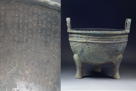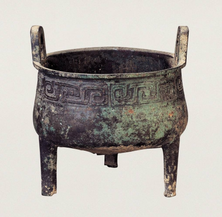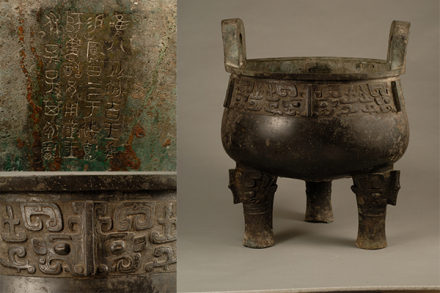鑄于周康王時(shí)期,造型敦厚雄偉,紋飾莊重神奇。通高77厘米,口徑56.5厘米。立耳,深腹,平沿方唇,三柱足?谘叵嘛椄〉駹铟吟鸭y,地襯細(xì)雷紋。三足根部飾大饕餮面。雙耳外側(cè)各飾一條曲體上緣的夔龍。腹外壁及底部厚積煙跡,顯系長期使用所致。腹內(nèi)壁鑄有銘文28字。旟鼎承襲商代圓鼎風(fēng)格,造型厚重莊嚴(yán),紋飾十分精美,所刻銘文是研究周初土地制度的重要史料,具有珍貴的歷史及藝術(shù)價(jià)值,加之鑄刻時(shí)代明確,被公認(rèn)為周康王時(shí)的標(biāo)準(zhǔn)器,是一尊著名的西周時(shí)期的國寶。