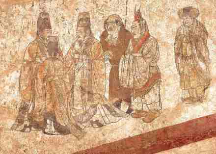 高185厘米,寬247厘米。繪于章懷太子墓道東壁。畫面中共有六位人物,前三位是唐朝鴻臚寺官員,均著初唐朝服,頭戴籠冠,身穿闊袖紅袍,白裙曳地,腰系綬帶,手持笏板,足登朝天履,呈三角狀站立。三人氣度沉穩(wěn),雍容自如,神情肅穆,面面相對(duì),似乎正在商討事宜。后面三位,為首一人推斷應(yīng)是來自東羅馬的使節(jié)。中間一人推斷是來自朝鮮半島的新羅使節(jié)。最后一位應(yīng)來自中國東北靺鞨族。這三位使者均躬身,畢恭畢敬,謙卑的神情中流露出期盼、等待之意。