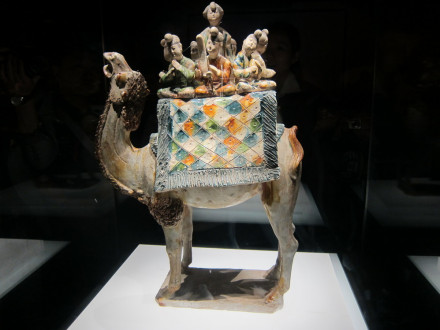 通高58厘米,高24.2厘米,口徑12.4厘米,足徑14.3厘米。典型的盛唐時(shí)期的作品,舞樂者均穿著漢族衣冠,使用的卻大都是從西域傳入的樂器,表現(xiàn)的是流行于開元、天寶時(shí)期的“胡部新聲”的新舞樂。這組俑以狹小的駝背作舞臺(tái),卻承載陣容龐大的樂隊(duì)來表現(xiàn)當(dāng)時(shí)流行的新舞樂,大膽運(yùn)用了藝術(shù)夸張,充滿想象與浪漫。制作工藝精湛,形態(tài)逼真?zhèn)魃,使人仿佛耳聞(dòng)茡P(yáng)的樂曲。釉色鮮明亮麗,協(xié)調(diào)自然,堪稱唐三彩中的極品。不僅具有很高的藝術(shù)欣賞價(jià)值,對(duì)研究盛唐時(shí)期的音樂、歌舞以及中外文化交流也具有重要的參考價(jià)值。