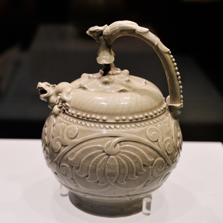 這件提梁倒灌壺是著名的耀州窯(窯址在今陜西省銅川市王益區(qū)黃堡鎮(zhèn))產(chǎn)品。耀州窯是唐宋時(shí)中國北方名窯,時(shí)人推崇耀瓷“巧如范金,精比琢玉”。此壺造型古樸典雅,制作規(guī)整精細(xì),紋紋繁褥華麗,尤其是構(gòu)思奇特,設(shè)計(jì)巧奪天工,被認(rèn)為是國內(nèi)外存世耀州窯瓷器中最為精美的一件。