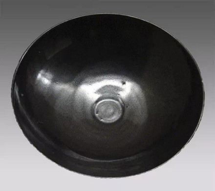 高9厘米、口徑30.2厘米、足徑11.8厘米。碗大口小足,胎質(zhì)灰白,通體施黑釉。油層表面布滿了大小不一,稱金屬光澤的小圓點(diǎn),這些圓點(diǎn)就像浮在水面上的油滴一樣,因此被成為”油滴釉“。油滴釉是黒釉中一個(gè)特殊的種類,屬于結(jié)晶釉。迄今所見的油滴釉器多出自建窯,胎體較厚,器型較小,這件黑釉“油滴”瓷碗,胎體厚重,釉面漆黑。如此之大和如此之美的油滴碗,具有典型的北方窯口的工藝特征,特別是環(huán)布碗底的油滴斑點(diǎn),晶瑩透亮,增添迷人的色彩,堪稱瓷中珍品。是迄今所見同類器物中體量最大的一件。 |