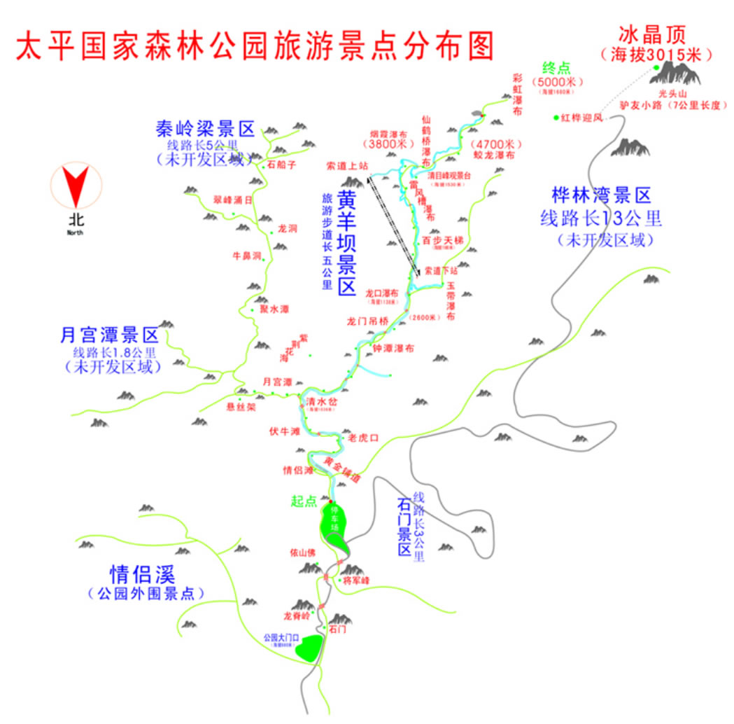 太平國家森林公園位于陜西省西安市戶縣太平峪內(nèi)。距西安44公里,咸陽60公里,總面積6085公頃。海拔在880米-3000米之間,最高是冰晶頂3015米。年均氣溫7-10℃,最高氣溫29℃。屬于冰晶頂韌性剪切帶與構(gòu)造混合巖化園區(qū)。園內(nèi)植物資源豐富、種類繁多,國家保護(hù)一、二類動(dòng)物30多種。