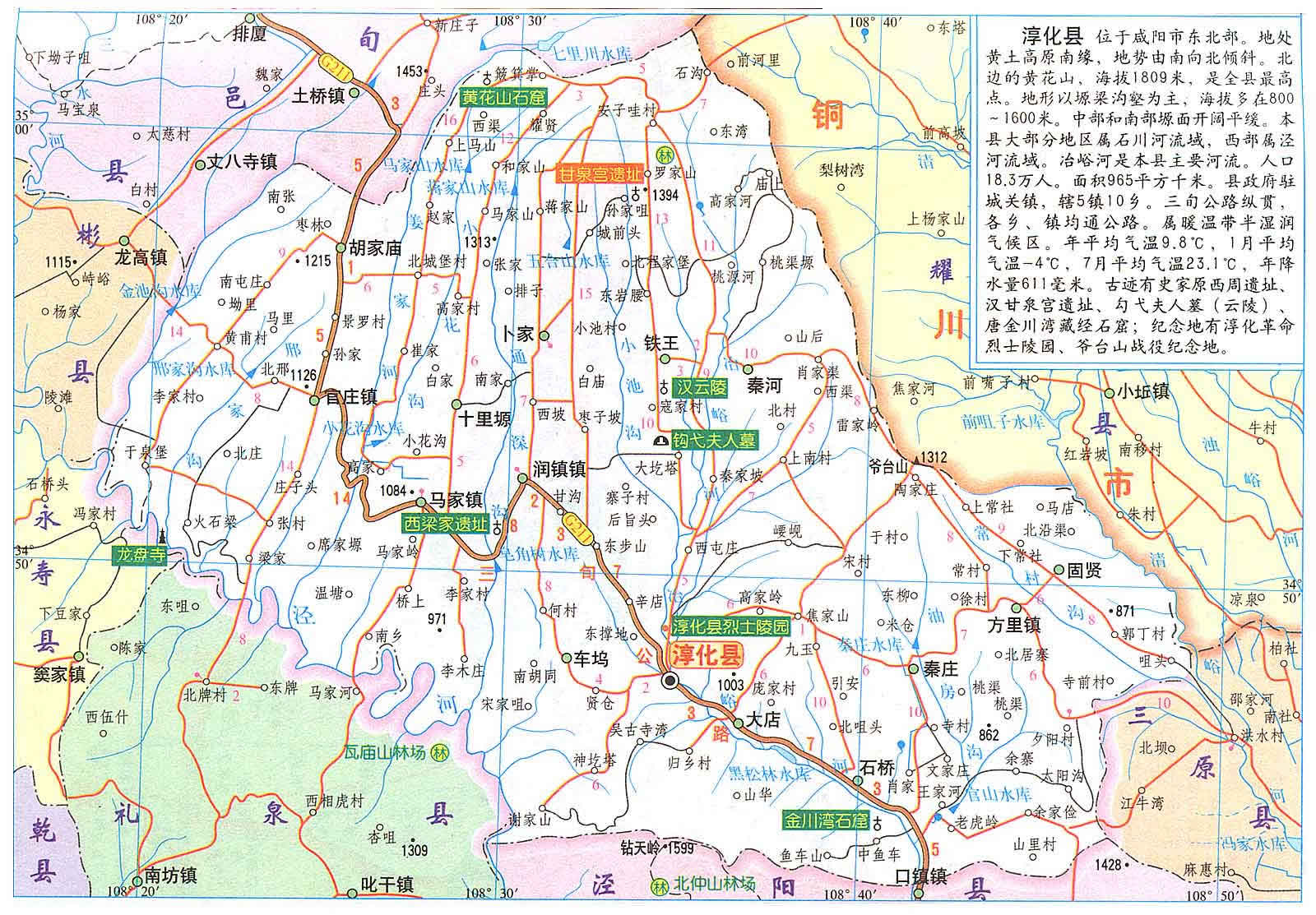 淳化縣以北宋太宗淳化年號而名。淳化縣位于三秦之腹,涇水之陽,南接北仲、嵯峨二山,北枕子午嶺余脈甘泉山(今黃花山),東依爺臺山,西鄰金池水。山圍水繞,盆抱而聚。冶峪蜿蜓貫其腹,涇水滔滔繞西南。是一個(gè)典型的山區(qū)農(nóng)業(yè)縣、革命老區(qū)縣和國家新一輪扶貧開發(fā)重點(diǎn)縣。全縣總面積983.81平方公里,耕地面積54萬畝,轄5鎮(zhèn)10鄉(xiāng)204個(gè)行政村,總?cè)丝?0.54萬人,其中農(nóng)業(yè)人口17.53萬人。境內(nèi)地勢北高南低,海拔630—1808.9米,地貌可概括為”一丘一山三溝五塬”。生態(tài)環(huán)境優(yōu)越,林草資源豐富,先后被評為“陜西省綠化模范縣”和“全國綠化模范縣”。傳統(tǒng)文化積淀深厚,民俗民風(fēng)淳樸,文物古跡眾多,秦直道、秦林光宮、漢甘泉宮、唐“三階教”石窟遺風(fēng)猶存。革命戰(zhàn)爭時(shí)期是陜甘寧邊區(qū)的南大門,鄧小平、劉志丹、習(xí)仲勛等老一輩無產(chǎn)階級革命曾在這里生活、戰(zhàn)斗過,震驚中外的爺臺山戰(zhàn)役就發(fā)生在這里。