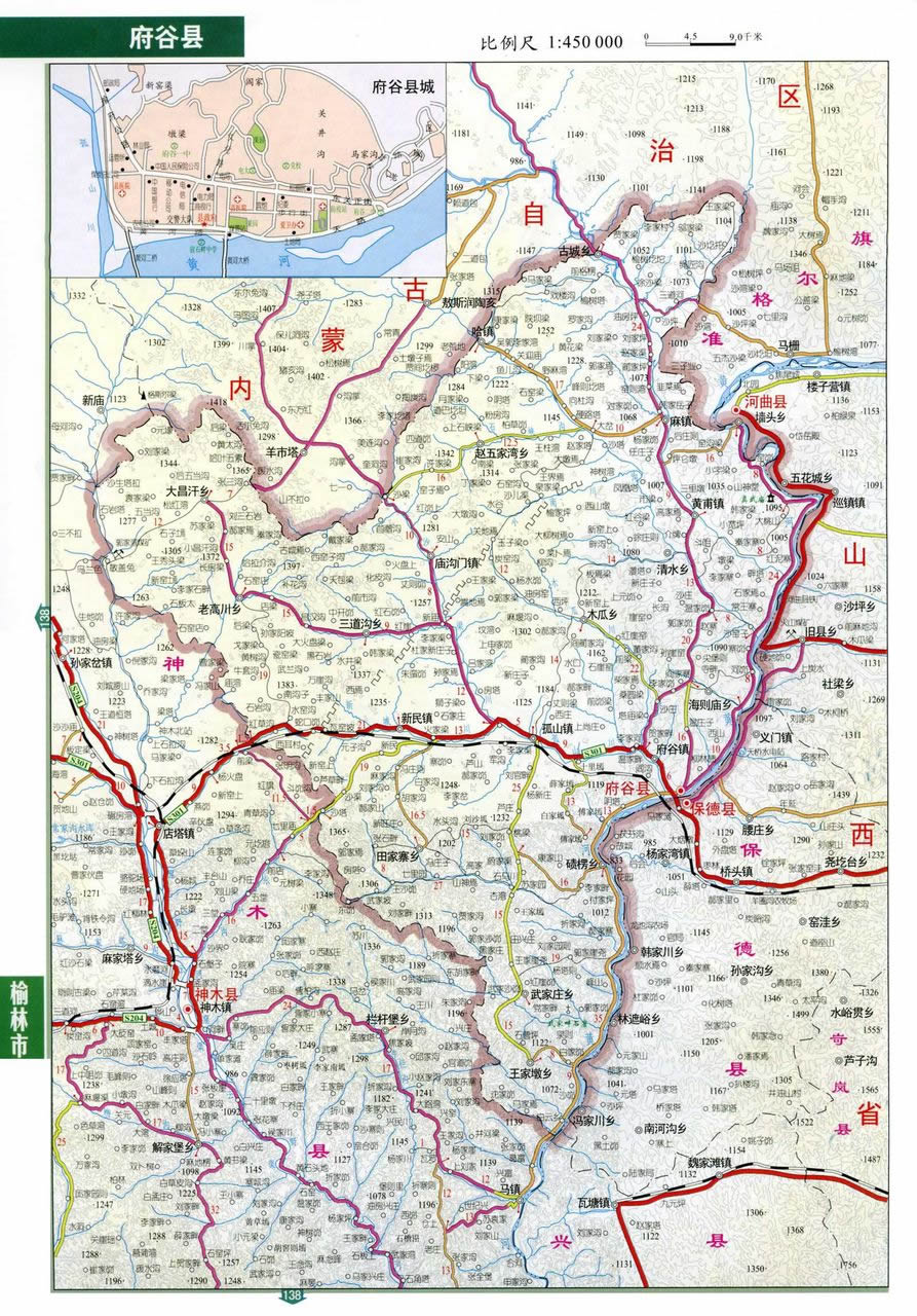 鎮(zhèn):府谷鎮(zhèn)、麻鎮(zhèn)、哈鎮(zhèn)、黃甫鎮(zhèn)、廟溝門鎮(zhèn)、新民鎮(zhèn)、孤山鎮(zhèn)、清水鎮(zhèn)、大昌汗鎮(zhèn)、古城鎮(zhèn)、三道溝鎮(zhèn)、老高川鎮(zhèn)