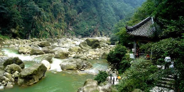 九龍溝:位于崇州市西北三郎鎮(zhèn),因“九溝九槽九條龍”的神話傳說而得名。這一地區(qū)為龍門山脈口段前斷裂帶,地質(zhì)構(gòu)造復(fù)雜,群山在海拔700米到3868米之間起伏變化,相對(duì)高差懸殊較大,懸崖陡峭,多飛瀑迭湍、深溝狹谷,有眾多的酷似龍形的奇峰怪石和飛瀑流泉。九龍溝內(nèi)水石相擊之聲如龍吟似龍嘯,巨石躺臥之狀如龍盤似龍睡,山峰聳立之形如龍騰似龍臥,簡(jiǎn)直就是活生生的“人間龍宮”。崇州百姓中流傳有“九條龍從九龍池出游,在九龍山會(huì)合,回九龍溝安家,并在龍?zhí)蚴狭粝戮艤暇挪劬艞l龍”的神奇?zhèn)髡f。九龍溝景區(qū)面積175平方公里,其中游覽面積32平方公里,由九龍溝水石景區(qū)、大西山原始森林景區(qū)和古寺等三部分組成,以九龍溝動(dòng)態(tài)水石景觀最引人入勝,是風(fēng)景區(qū)的主要部分,有化石巖、珍珠泉龍石巖、龍女浣紗池、龍?zhí)蚴、鉆天峰、響水溝、九龍飛瀑等景觀,其中龍女融積雪而成的“九龍飛瀑”,寬10余米,高100余米,是成都地區(qū)不可多見的大瀑布。密林中隱藏著雄偉的古剎,是成都地區(qū)山林中保存較完好的規(guī)模較大的古廟。