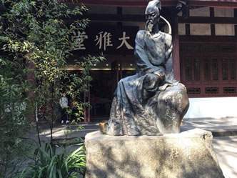 “廨”是官署的意思,即古代地方官吏辦公的場(chǎng)所。杜甫一生仕途坎坷,始終不得重用。清嘉慶十六年重修草堂時(shí),考慮到杜甫曾經(jīng)做官,應(yīng)該有辦公的場(chǎng)所,大廨便由此得命名。大廨正中杜甫的銅像是我國(guó)著名雕塑家錢紹武先生的作品。是一座敞廳式建筑,是中軸線上的第二重建筑。
