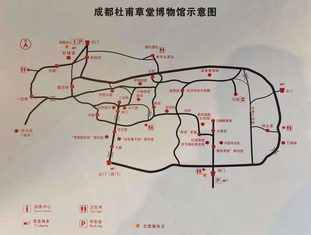 成都杜甫草堂博物館核心文物區(qū)內(nèi),有照壁、正門、大廨、詩(shī)史堂、柴門、工部祠等景點(diǎn)。