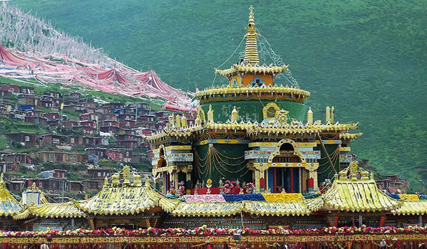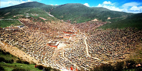 色達佛學院 距色達縣城20余公里處,有一條山溝叫喇榮溝,順溝上行數(shù)里,就是舉世聞名的喇榮寺五明佛學院,也稱色達佛學院。色達佛學院是世界上最大的藏傳佛學院之一。