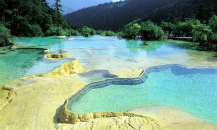 進(jìn)入黃龍景區(qū),首先看到的是一組精巧別致、水質(zhì)明麗的池群--迎賓池。池子大小不一,形狀奇特,色彩艷麗,錯(cuò)落有致,四周山岳環(huán)峙,林木蔥蘢,山間野花競(jìng)放,彩蝶飛舞。山間石徑曲折盤旋,點(diǎn)綴著觀景亭閣,倍添情趣。