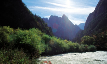 從黃龍溝底部(海拔2000米)到山頂(海拔3800米)依次出現(xiàn)亞熱帶常綠與落葉闊葉混交林、針葉闊葉混交林、亞高山針葉林、高山灌叢草甸等。