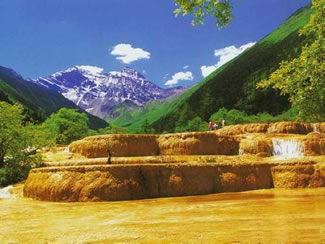 位于岷山主峰雪寶頂,下臨涪江源流——涪源橋,是一條長(zhǎng)7.5公里、寬1.5公里的緩坡溝谷。溝內(nèi)布滿乳黃色巖石,遠(yuǎn)望好似婉蜒于密林幽谷中的黃龍,黃龍溝名即來(lái)源于此。明代(公元1368~1644年)在此修建了黃龍寺,用以奉祀黃龍。黃龍溝以它“奇、絕、秀、幽”的自然景觀而蜚聲中外,它酷似中國(guó)人心目中“龍”的形象,藏民稱之為“東日·瑟爾磋”,意為東方的海螺山(指雪寶頂)、金色的海子(指黃龍溝),并沿襲著一年一度盛況煊赫、波及西北各省區(qū)各族民眾參加的轉(zhuǎn)山廟會(huì)。 黃龍溝連綿分布鈣化段長(zhǎng)達(dá)3600米,最長(zhǎng)鈣化灘長(zhǎng)1300米,最寬170米;彩池?cái)?shù)多達(dá)3400余個(gè);邊石壩最高達(dá)7.2米。