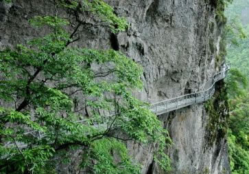 棧道最寬處1.45米,最窄處0.6米,共217級石階,沿崖遷回而下,可到大佛腳底。