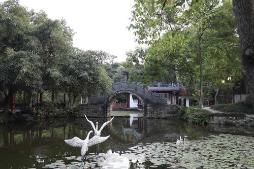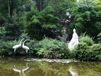 過蓮池旁的“山谷小憩”,亦為園中一景。其間,黃庭堅(jiān)身著便裝,手拿書卷,在池旁靜坐沉思。兩只白鶴立于水中相伴,此景也稱“雙鶴伴涪翁”,優(yōu)雅清新,寓味深長,形象地表現(xiàn)了黃庭堅(jiān)在謫居戎州時,平和豁達(dá)的心態(tài)。