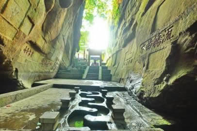 仿照東晉書法家王羲之蘭亭集會流觴曲水的意境,黃庭堅(jiān)利用這峽谷的地形和天然泉水,修建了900多年來遐邇聞名的流杯池。保持其天然的山水景致是文人造園崇尚自然的山水理念,流杯池內(nèi),從谷底到崖壁頂,蜿蜒臺階而上,幾個平臺錯落其間,時而寬敞平緩,時而臨崖高懸,這樣的美景是黃庭堅(jiān)在領(lǐng)會自然美的規(guī)律上進(jìn)行的藝術(shù)再創(chuàng)造。