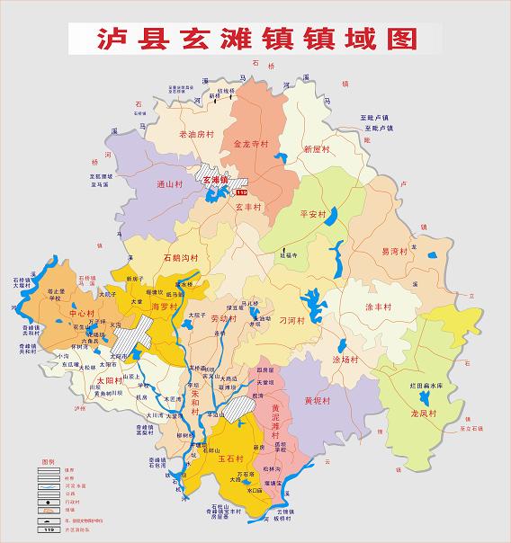 瀘縣玄灘鎮(zhèn)鎮(zhèn)域圖 行政區(qū)劃 瀘縣玄灘鎮(zhèn)幅員面積115平方公里,轄區(qū)內(nèi)人口9萬人,城鎮(zhèn)建成區(qū)面積2平方公里,常住人口2.2萬人。轄5個社區(qū)、20個行政村《正大街社區(qū)、東街社區(qū)、西街社區(qū)、中和社區(qū)、喻坪社區(qū) 》、《石鵝溝村、金龍寺村老油房村、通山村、石鵝溝村、玄豐村、新屋村、平安村、刁河村、黃坭村、涂場村、龍鳳村、涂豐村、易灣村 、太陽村、中心村、海羅村、玉石村、黃泥灘村、勞動村、朱和村》! 歷史沿革 1934年設(shè)玄灘鎮(zhèn),1937年改鄉(xiāng),1951年復建鎮(zhèn),1958年改公社,1992年再復鎮(zhèn)。1997年,面積74平方千米,人口5.6萬,轄龍鳳、飛躍、永紅、涂鋒、刁河、馮光、黃泥、同豐、黃林、新山、平安、光前、紅星、向灣、易灣、斷石龍、新屋、蔣灣、金龍寺、新房子、玄鋒、高場、陳家咀、石鵝溝、通山、萬居所、桑壩、東風、宋糟坊、瓦子壩、清油坊31個行政村和正大街、馬路街、半邊街、鹽聯(lián)街4個居委會。 2004年,面積78平方千米,轄31個村、4個社區(qū),總?cè)丝?7621人。集鎮(zhèn)建成區(qū)面積1.7平方千米,常住人口2.15萬人。 2006年,將原玉河鎮(zhèn)所屬行政區(qū)域并入玄灘鎮(zhèn)。玄灘鎮(zhèn)政府駐玄灘場。
