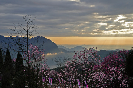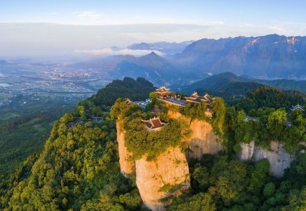 位于江油城北25千米的涪江東岸,是國家地質(zhì)公園、國家重點文物保護單位。整座山峰巖體裸露,丹赤如霞,三峰矗立,似一道畫屏,屬典型的礫巖丹霞地貌。自麓至頂約5千米許,行道迂回盤旋,林木蒼翠,景色秀麗。竇圌山以其山形外貌似圌(上小下大的糧屯)礫石如豆,故名圌山,到了唐高宗時期,彰明縣主簿竇子明慕此山清奇幽秀而棄官隱居山上,修道成功羽化飛仙,于是“山不在高,有仙則名”從此圌山冠以竇姓,由此得名竇圌山。詩仙李白少年游山時被如畫的美景所吸引,留下了膾炙人口的千古絕句:“樵夫與耕者,出入畫屏中”。