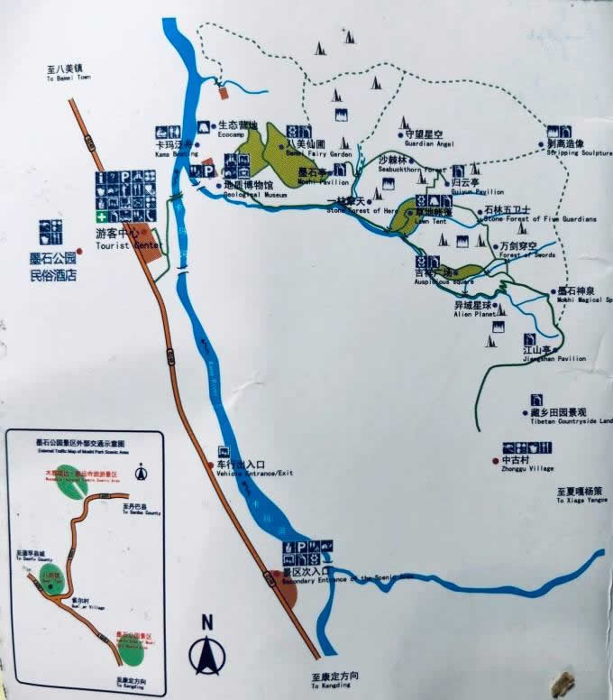 中國墨石公園景區(qū)位于四川省甘孜州道孚八美鎮(zhèn)卡瑪村與中古村交界處,地處中國最美景觀大道318國道核心區(qū),緊鄰丹巴美人谷、康定新都橋、雅江康巴漢子村等知名景區(qū),距八美鎮(zhèn)約6公里,川藏公路旁400米處。面積5平方公里,海拔約3500米。是香格里拉之巔海螺溝通向香格里拉之魂稻城亞丁的中轉(zhuǎn)站,擁有壯美草原、婉約濕地、奇幻墨石、特色民居、高原花海、金色彩秋、白塔圣寺、日出日落八大奇觀!按嘿p格桑夏避暑,秋觀彩林冬踏雪”是一年四季風(fēng)光的特色,而綿延在鮮水河斷裂帶上的墨石天然景觀更為世人向往,被譽(yù)為“中國最美景觀大道第八美”。