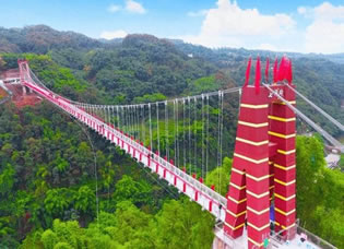七洞溝9D云海玻璃橋橫騎南屏山山脈與佛來山山脈峽谷之上,全長386米,寬3.3米,垂直落差188米,在中國西南部地區(qū)長、寬、高都名列第一,是長寧旅游大發(fā)展靚麗新畫卷之一。玻璃橋采用最新9D技術(shù),以仿真場景與感應(yīng)設(shè)置模擬多種特殊效果、立體畫面,將視覺、聽覺、觸覺和動感完美地融為一體,給游客帶來驚心動魄的刺激感受。走在橋上,不僅可以俯瞰綿溪河,還可以飽覽南屏山脈、佛來山脈等2座群山的英姿;晴天時,藍(lán)天和白云的倒影鋪滿天橋,讓人在對透明的腳下戰(zhàn)戰(zhàn)兢兢之余,更樂享于踏云而行的快感;而云霧天氣時,玻璃橋則在霧中若隱若現(xiàn),天上人間的美景更是讓人驚嘆不已。