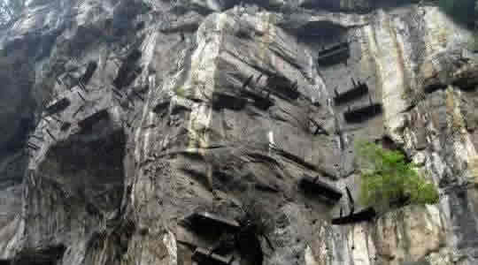 珙縣洛表麻塘壩和蘇麻灣是僰人懸棺最集中的地方,僅在縱深四千米長(zhǎng)的麻塘壩懸崖絕壁上,現(xiàn)存上萬個(gè)棺樁棺孔;數(shù)百具懸棺,是世界上懸棺分布最集中,保存最完好,數(shù)量最多的地區(qū),被譽(yù)為“世界一絕”、“天然懸棺葬的博物館”。其悠久的歷史,神奇的傳說,神秘的文化,獨(dú)特的葬式,耐人尋味,千古難解。同時(shí),隨棺而作的數(shù)百幅巖畫,色彩鮮艷,栩栩如生;形象地再現(xiàn)了僰人時(shí)代的自然環(huán)境、社會(huì)生產(chǎn)、民風(fēng)民俗、宗教信仰,令人折服。入口處的“九盞燈”,因傳說三根橫木上共放有九盞“長(zhǎng)命燈”而得名,它前有點(diǎn)將臺(tái);右有石船。形如斧砍的石灰?guī)r絕壁上,分布了二十四具懸棺、六十二幅巖畫。懸棺神奇絕妙,府瞰萬眾;巖畫題材廣泛,內(nèi)容豐富,牽馬放牧,垂鉤釣魚、舞蹈、球戲、踢鍵娛樂。雖然構(gòu)圖簡(jiǎn)練,線條粗獷,卻富有濃郁的生活氣息和鮮明的民族風(fēng)格。而最遠(yuǎn),最高的當(dāng)數(shù)老鷹巖;14具懸棺懸置在110余米的峭壁上,為懸棺精華。而蘇麻灣山勢(shì)巍峨;奇巖崢嶸,河水澄澈清瑩,山光水色相映成趣,優(yōu)美迷人,在距水面50余米的懸崖峭壁上重重疊疊的放有50具懸棺,并留有大量樁孔,給人以奇異神秘的感受。另外,麻塘壩謝家灣,留有一民國建筑一何家大院,已有180多年的歷史,占地15畝,全為木質(zhì)結(jié)構(gòu),有三座院落,一個(gè)花園,二座石碉樓;雕刻精美,巧妙絕倫。