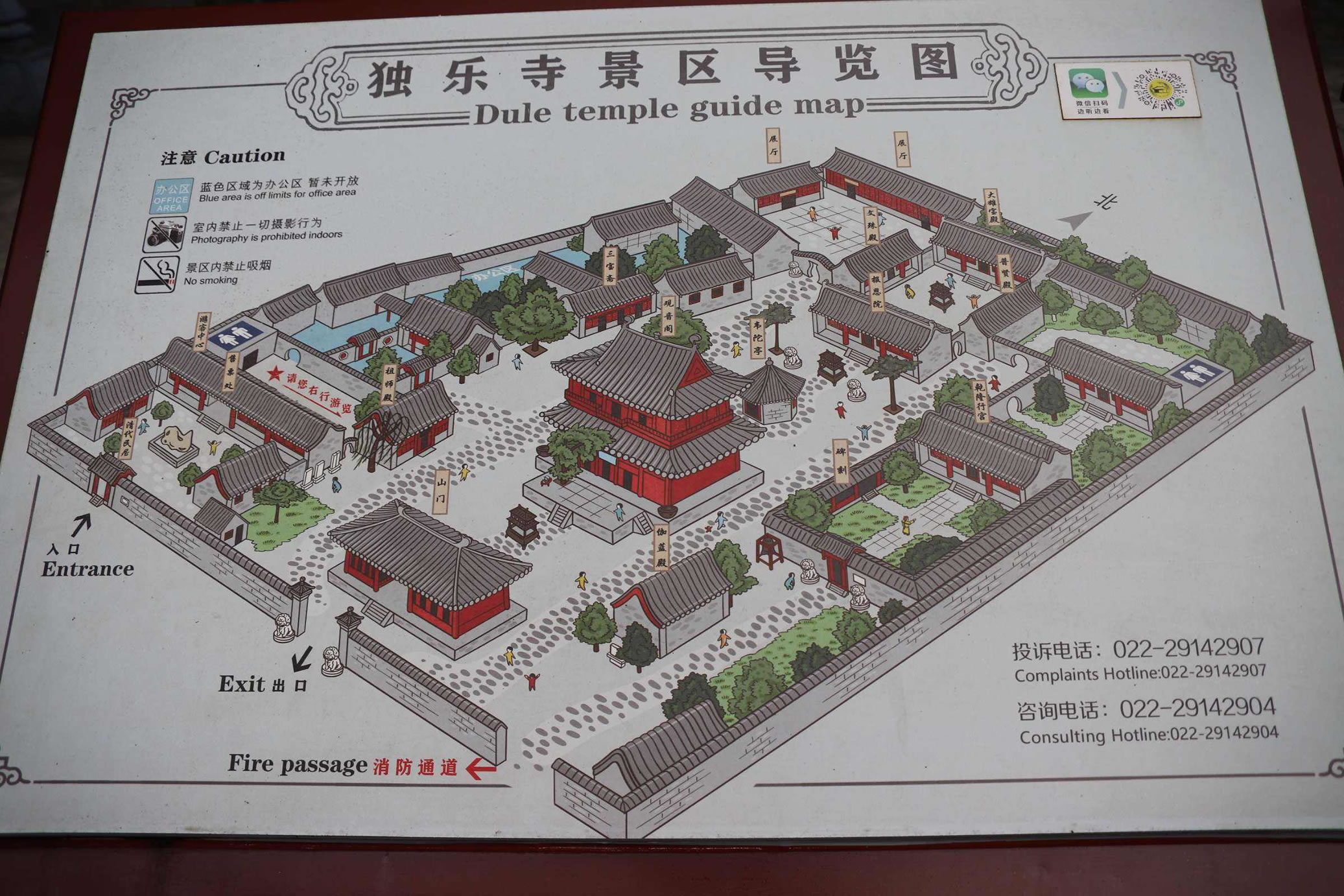 山門前兩稍間是兩尊遼代彩色泥塑金剛力士像,俗稱“哼”“哈”二將,后兩稍間是清代繪制的“四大天王”彩色壁畫。山門梁柱粗壯,斗拱雄碩,“升起”和“側(cè)腳”明顯。據(jù)說(shuō)山門的牌匾乃嚴(yán)嵩所題。