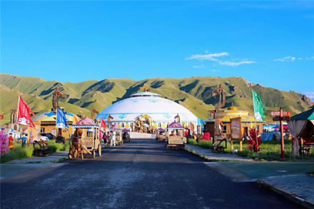 文化村是以當(dāng)?shù)赝翣栰杼厣钇鹁幼∷,以及一些生活中息息相關(guān)的物資修建而成,其中最引人注目的是中間最大的土爾扈特蒙古族汗帳。旅游季節(jié)在這里演藝大型舞臺(tái)實(shí)景劇《東歸印象》,該劇根據(jù)清乾隆三十六年(1771年)土爾扈特蒙古族克服重重艱難險(xiǎn)阻返回祖國(guó)懷抱的故事改編,該劇分《起義》《回家》《民族文化節(jié)日》三篇,演繹了東歸的過程和回歸后的幸福生活,演出場(chǎng)面宏大。當(dāng)?shù)氐哪撩,成百只馬匹、黑頭羊、牦牛、駱駝也參與演出,穿越時(shí)空,將東歸歷程中的愛情、親情、友情完整呈現(xiàn)。