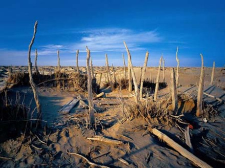 羅布泊干涸后,周圍生態(tài)環(huán)境發(fā)生巨變,草本植物全部枯死,防沙衛(wèi)士胡楊樹(shù)成片死亡,沙漠以每年3~5米的速度向羅布泊推進(jìn),很快和廣闊無(wú)垠的塔克拉瑪干沙漠融為一體。羅布泊從此成了寸草不生的地方,被稱作“死亡之!。