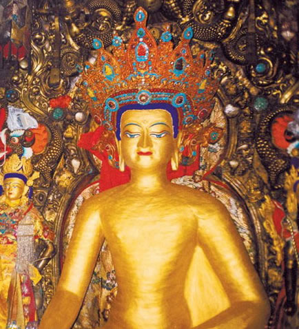 酥油燈后是大昭寺主殿正門,大昭寺最早的建筑都從正門開始;外院是后來修建、擴充的,而主殿是1400多年前的建筑。由于多年信徒的摩擦,門口的石頭地板光亮如鏡。大殿左右各有一尊巨大的佛像。左側(cè)為紅教創(chuàng)始人密宗大師蓮花生,他本來是印度的佛學(xué)家,公元八世紀進藏,在他入藏以后藏區(qū)開始出現(xiàn)密宗。右側(cè)是未來佛。