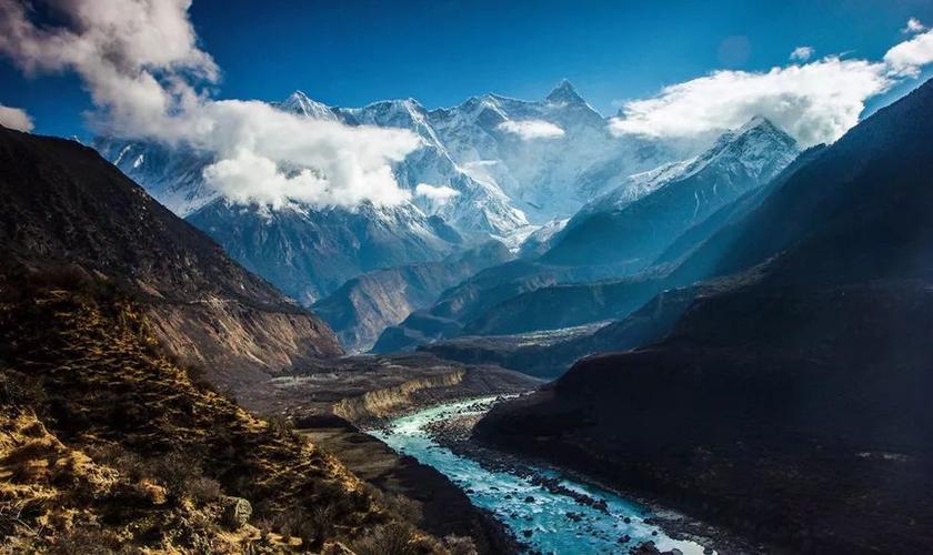 雅魯藏布江大峽谷兩側(cè),壁立高聳的南迦巴瓦峰(海拔7782米)和加拉白壘峰(海拔7234米),其山峰皆為強(qiáng)烈上升斷塊,巍峨挺拔,直入云端。峰嶺上冰川懸垂,云霧繚繞,氣象萬千。
