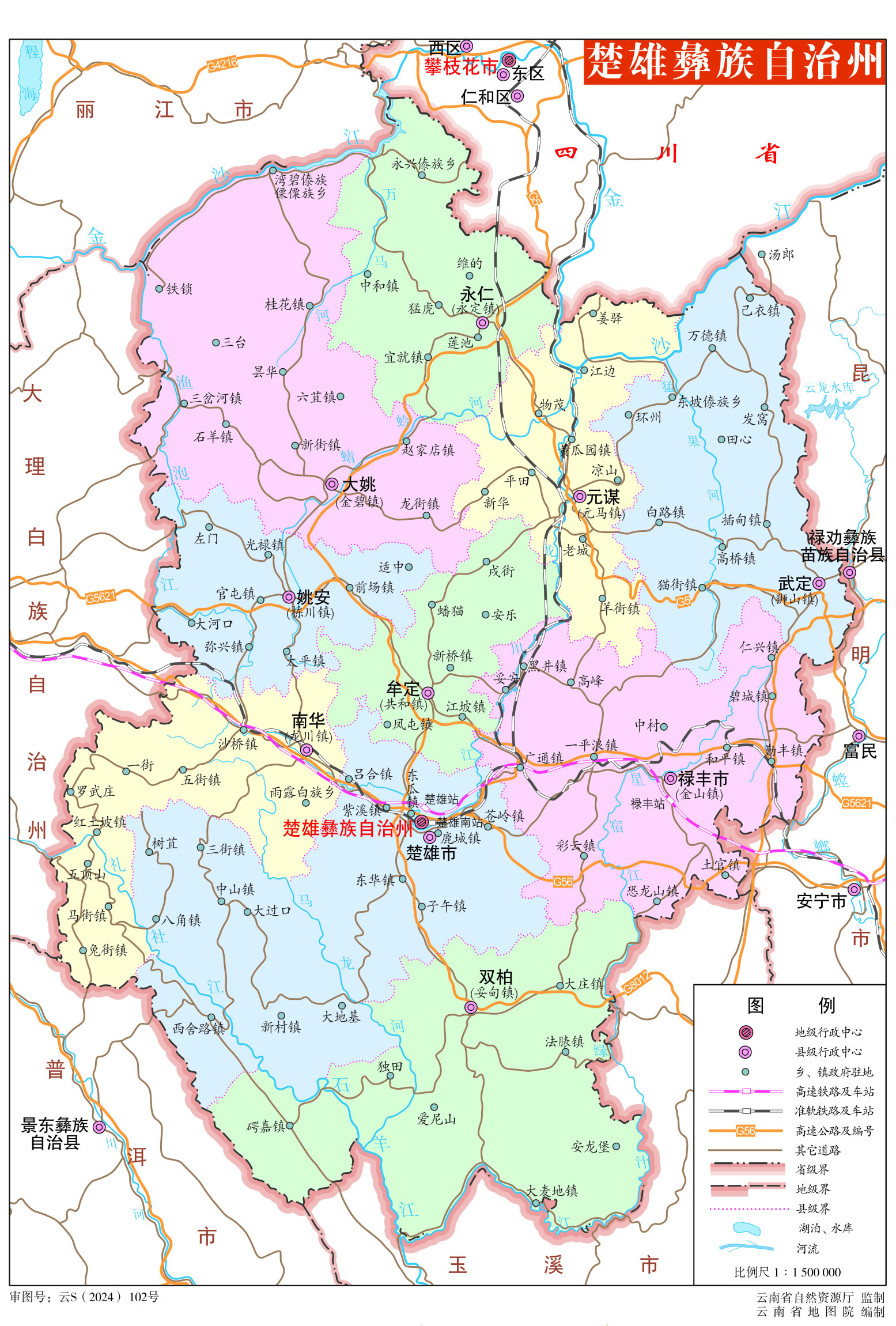 1983年9月,改楚雄縣為楚雄市,同年10月,劃祿勸縣歸昆明市。至此,楚雄彝族自治州形成設(shè)楚雄市和雙柏、牟定、南華、姚安、大姚、永仁、元謀、武定、祿豐共9縣1市的格局。